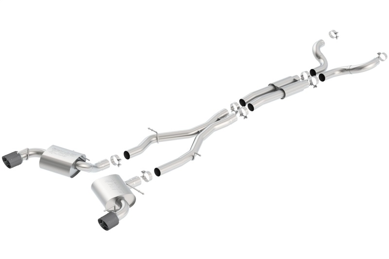 This 3″ diameter Cat-Back(tm) system is intended for vehicles with significant performance upgrades. It includes a merge X-Pipe for increased performance and improved sound. This system has the classic S-Type sound with no drone inside the vehicle. Each muffler assembly has unique single 4.5″ round carbon fiber with bright center tips. Borla(r) Cat-Back(tm) & Axle-Back exhaust systems feature patented straight-through and multi-core technology to unleash hidden horsepower. Increased exhaust velocity adds power, driving excitement, fuel economy, and the distinctive Borla(r) Sound of Power respected by motoring enthusiasts everywhere. Each system is built from premium T-304 austenitic stainless steel, superior to T-400 series knockoffs (such as 409), to give you the absolute best in performance and durability. Ultra-smooth mandrel bends ensure maximum flow & power, and precision computer numerical control (CNC) manufacturing ensures an accurate fit. Best of all, Borla(r) stands behind every system with a Million-Mile Warranty. Just what you’d expect from the world’s most experienced (and most winning) exhaust brand.